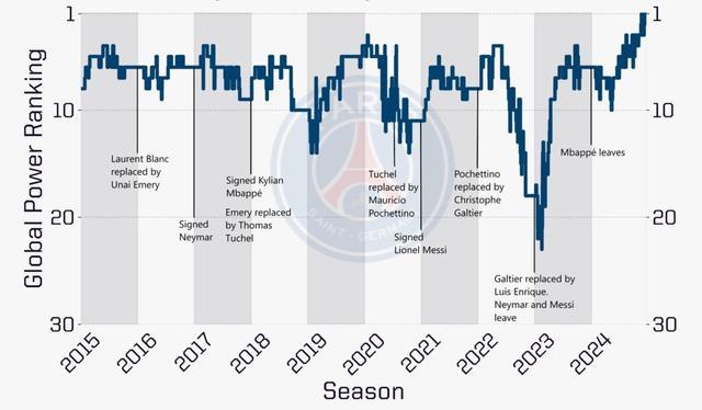 此后,巴黎圣日耳曼接连战胜西雅图海湾人、迈阿密国际、拜仁和皇马,强势重返榜首。若能在决赛击败世界第八的切尔西,其此次榜首之旅有望更为长久。回顾巴黎圣日耳曼过去十年,历经多位名帅及内马尔、梅西、姆巴佩等巨星时代,虽有起伏但国内荣誉不断。